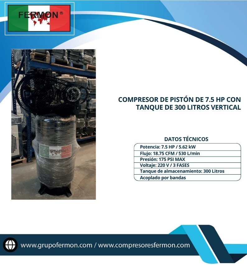 COMPRESOR DE PISTÓN FERMON DE 5 HP TANQUE DE 300 LITROS HOR