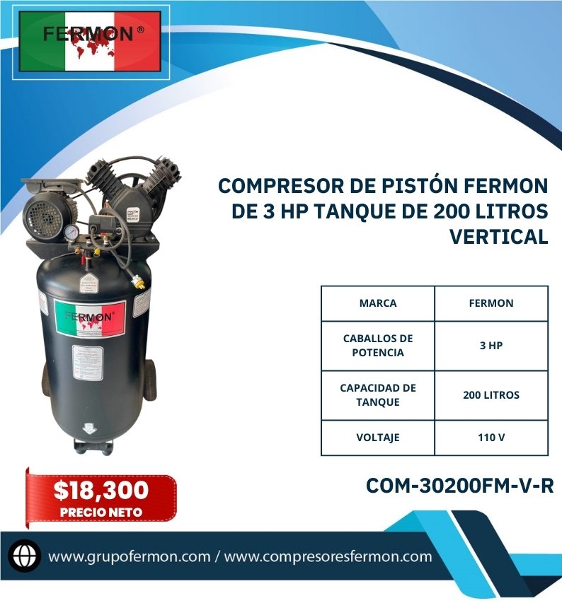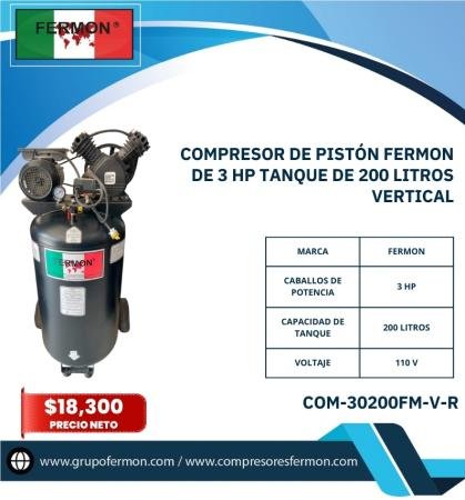COMPRESOR DE PISTÓN FERMON DE 3 HP TANQUE DE 200 LITROS VERTICAL