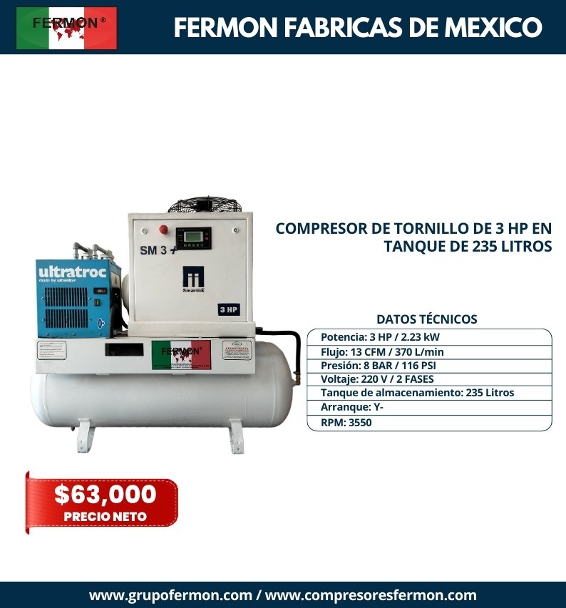 COMPRESOR DE TORNILLO DE 3 HP EN TANQUE DE 235 LITROS